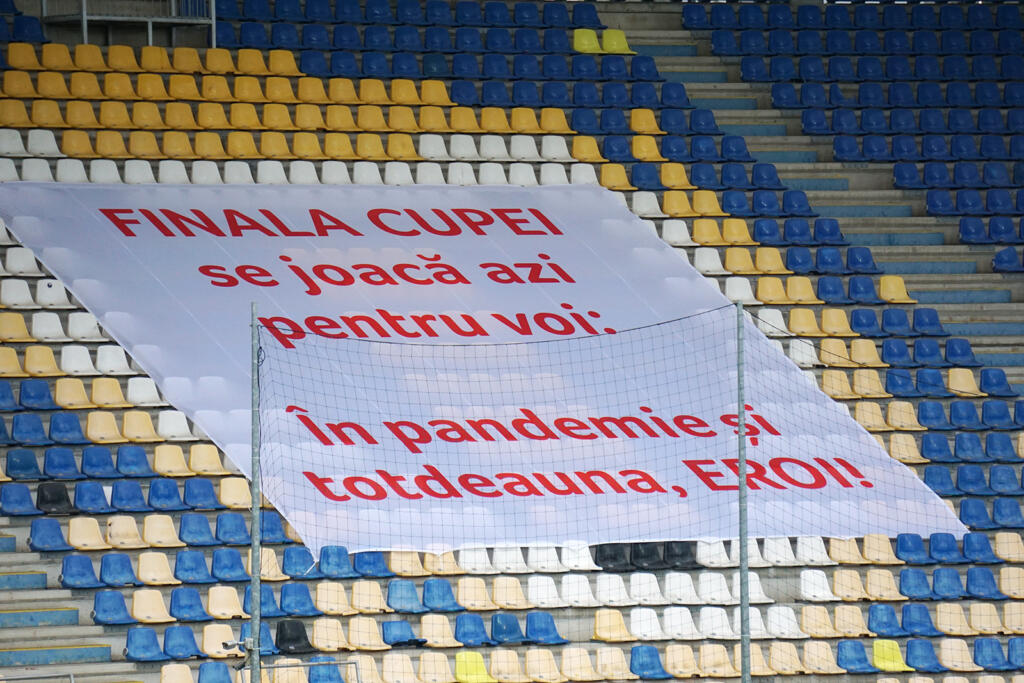 UPDATE | Înaintea fluierului de start a fost ținut un minut de reculegere în memoria tuturor românilor care și-au pierdut viața de la începutul pandemiei, dar și în memoria fostului președinte CCA, Dan Petrescu. Momentul a fost urmat de aplauze pentru toți eroii din linia întâi, cărora le-a fost dedicat și un banner: FINALA CUPEI se joacă azi pentru voi. În pandemie și totdeauna, EROI!