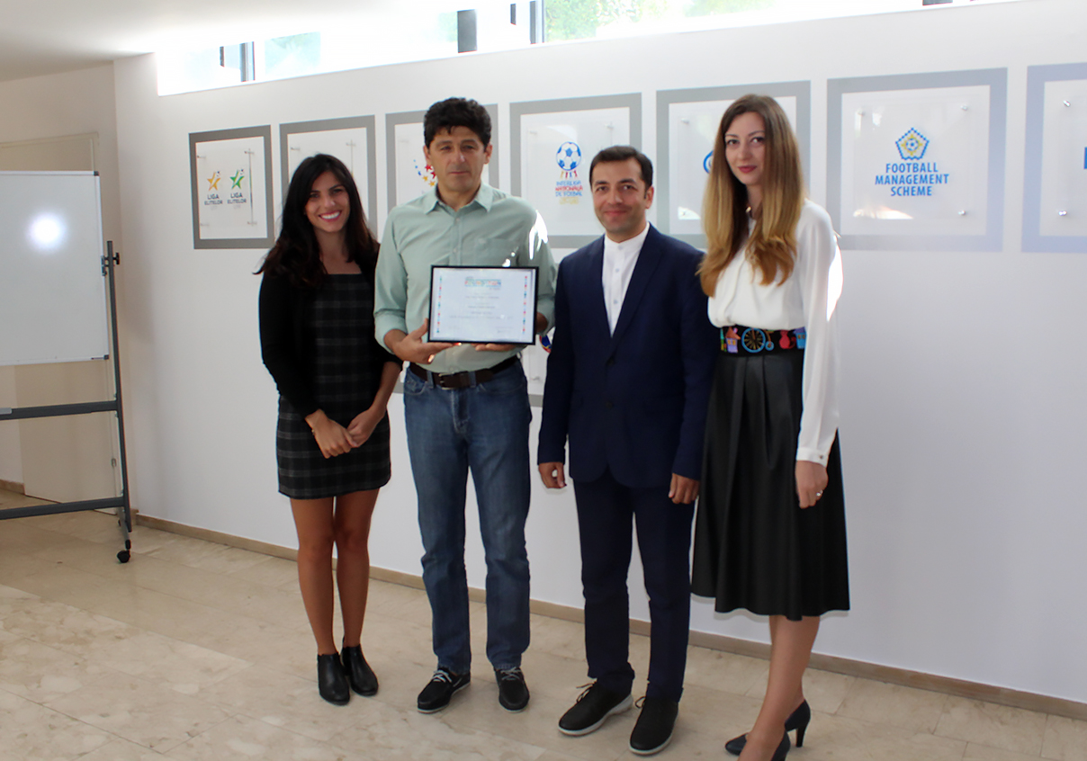 Ceremonia de înmânarea a premiului a avut loc miercuri, 6 septembrie 2017, la sediul FRF, în prezența reprezentanților FRF și Policy Center: Miodrag Belodedici, Membru al Comisiei Tehnice a FRF, Diana Pirciu, Specialist CSR – FRF, Raluca Negulescu-Balaci, Director Executiv al Policy Center, și Florin Botonogu, Președinte al fundației premiate.