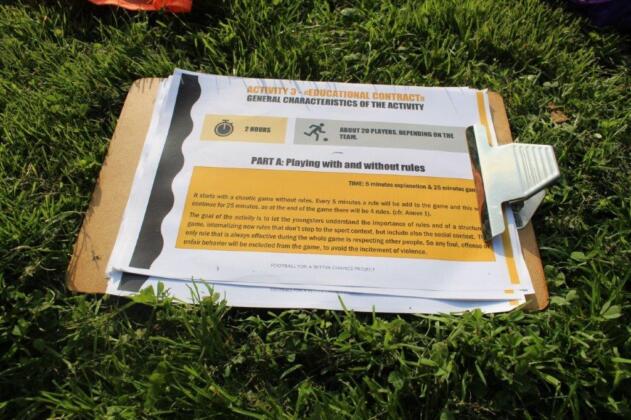 Playing with and without rules. The outcome of this activity is to show the importance of having rules and boundaries, the game is started as a normal football match with no rules. After a certain amount of time a rule is introduced by players one by one until we have a full set of rules. This is to show how important it is to have rules and to respect rules in our lives. The players soon realise after the game is started of the importance of having boundaries and rules.