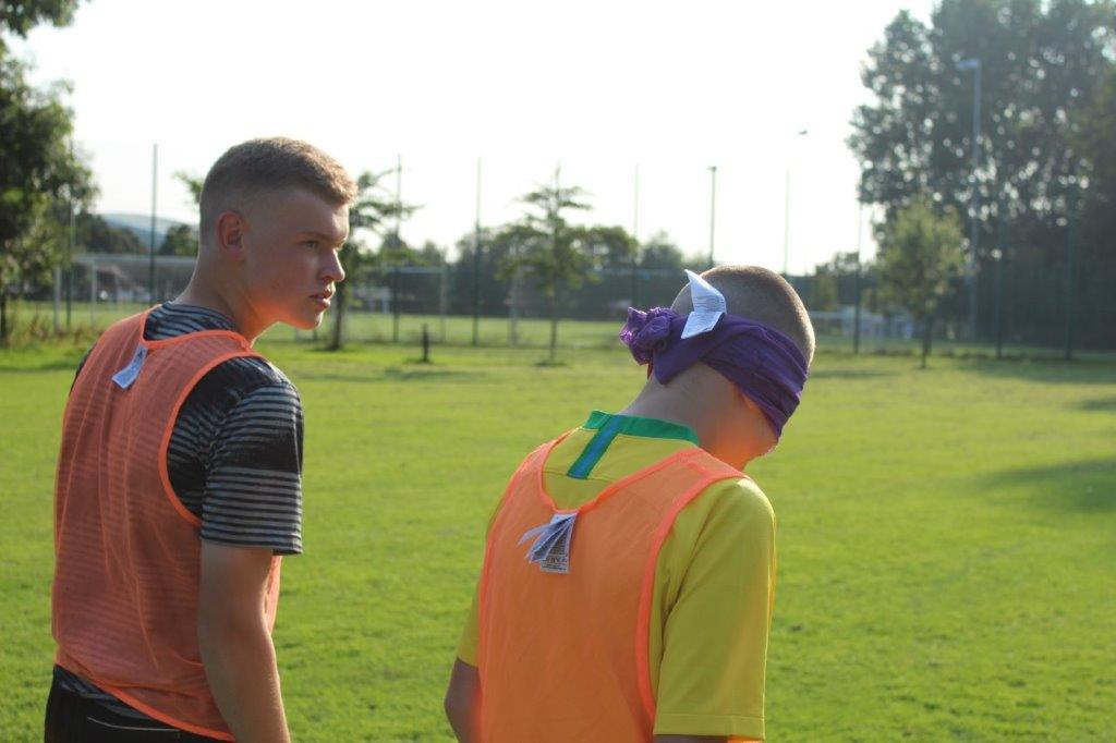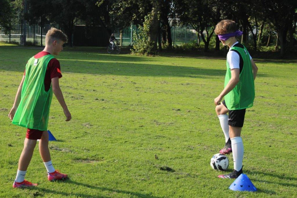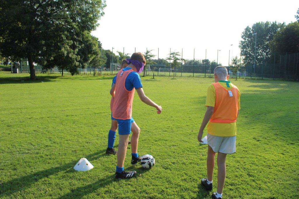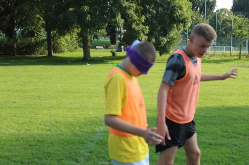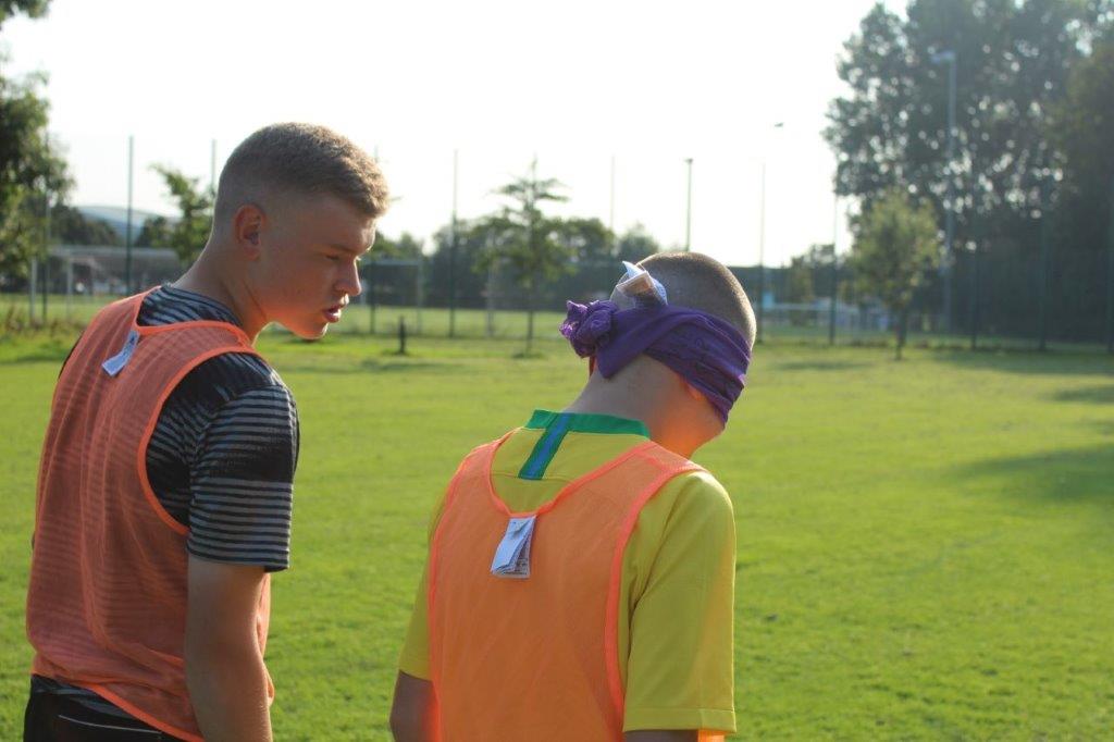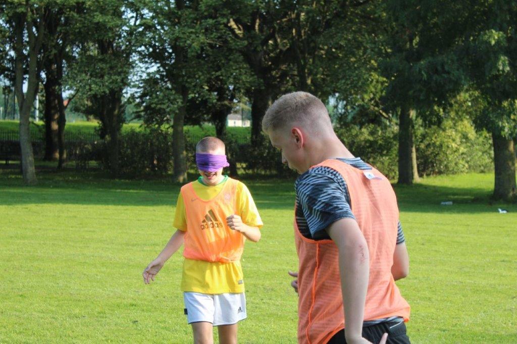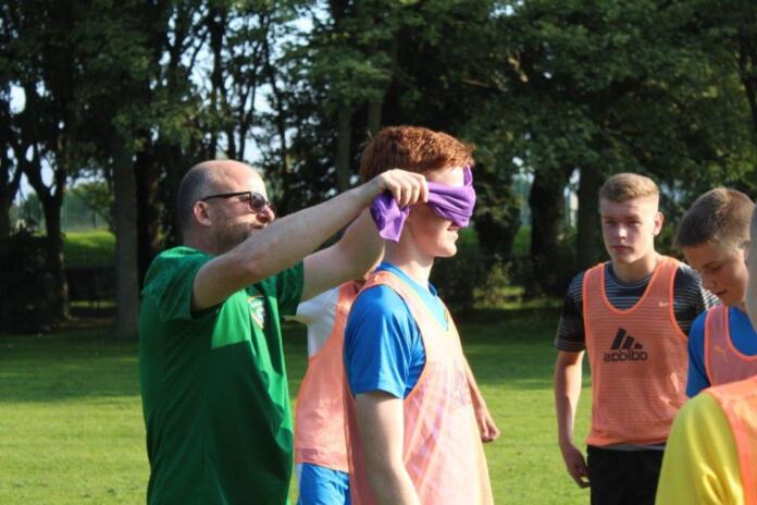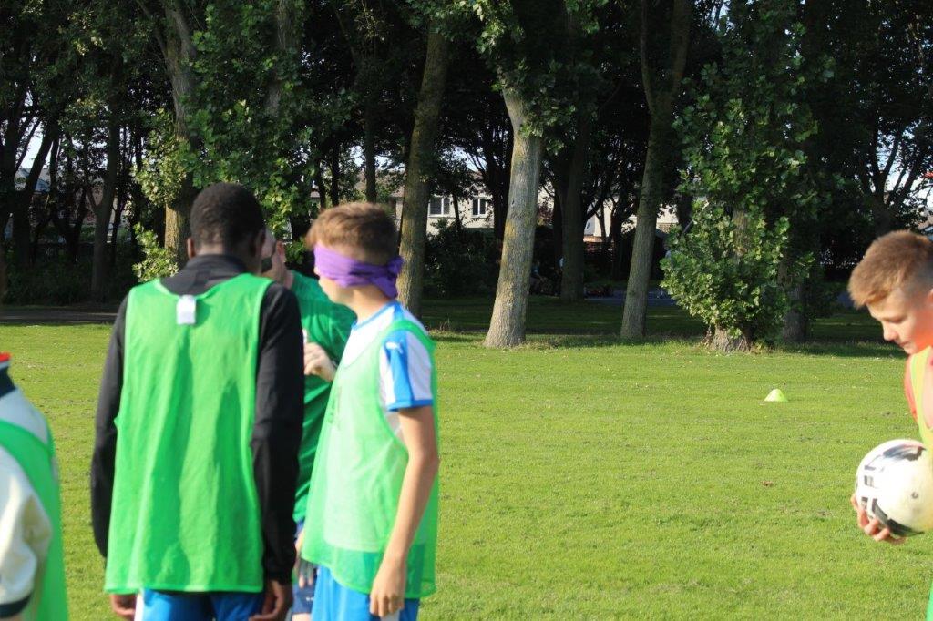 Teaming up. The outcome of this activity is to increase trust and communication between the participants. By one player guiding another through an obstacle course set out on the pitch, they are blindfolded and then guided by a partner. This opens the discussion of how important it is to trust in each other and the importance of good communication.