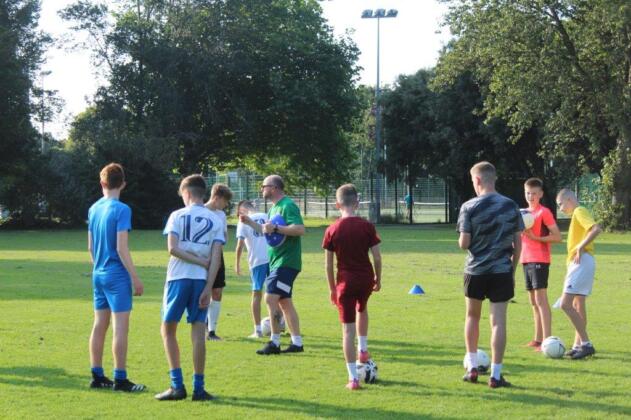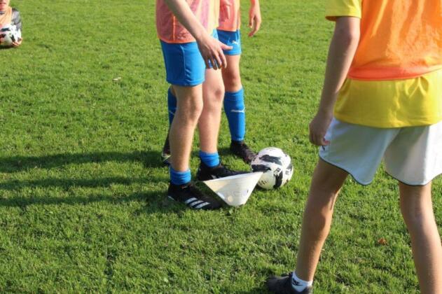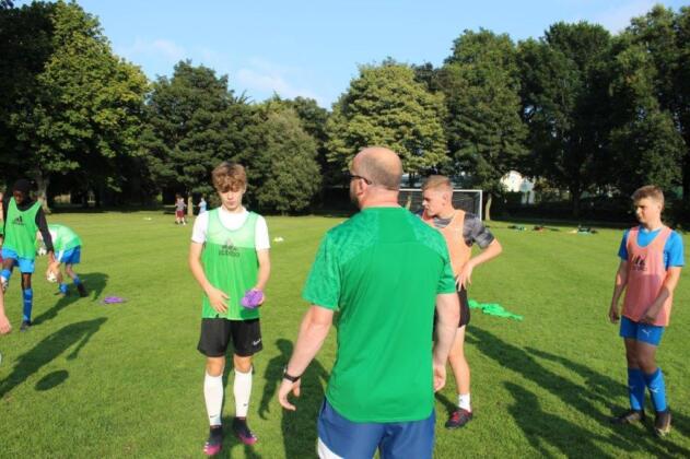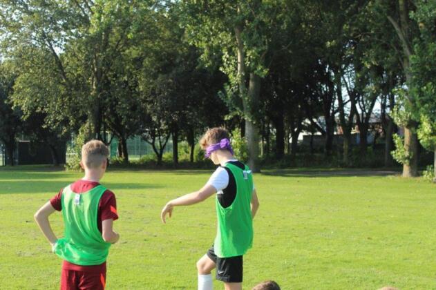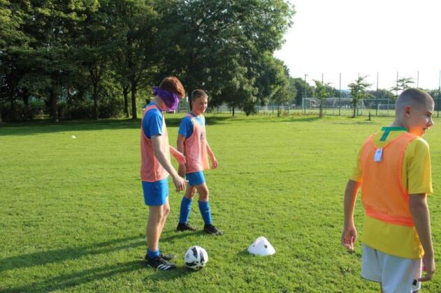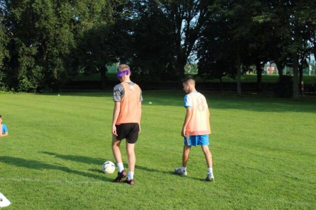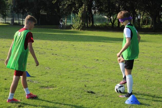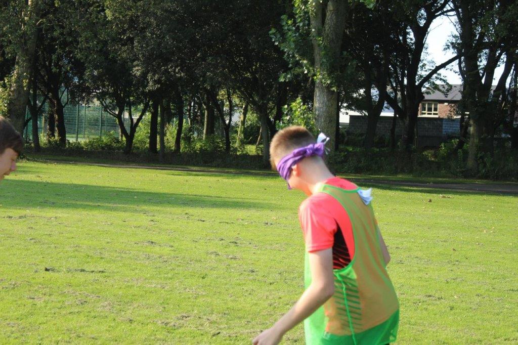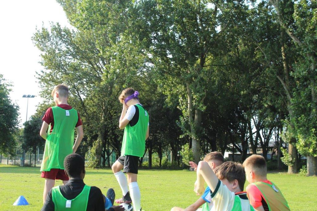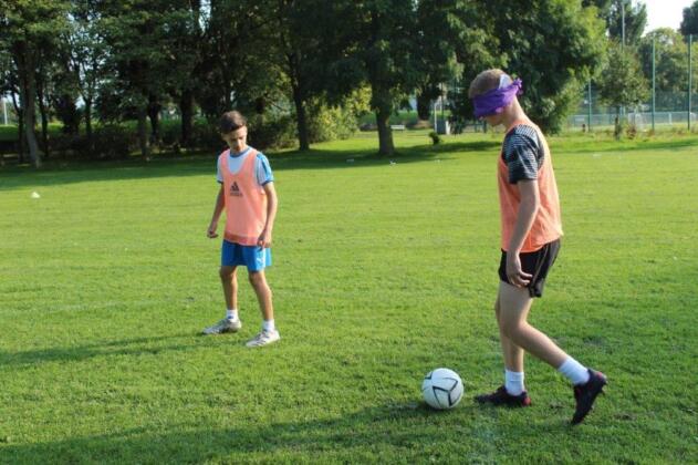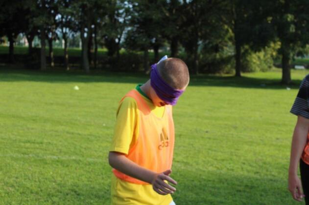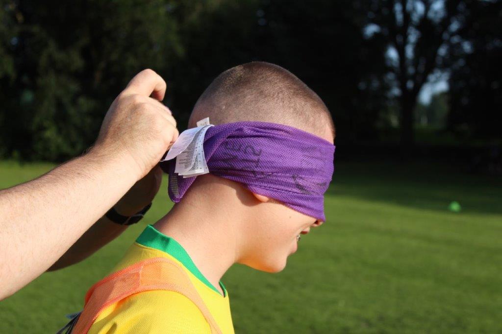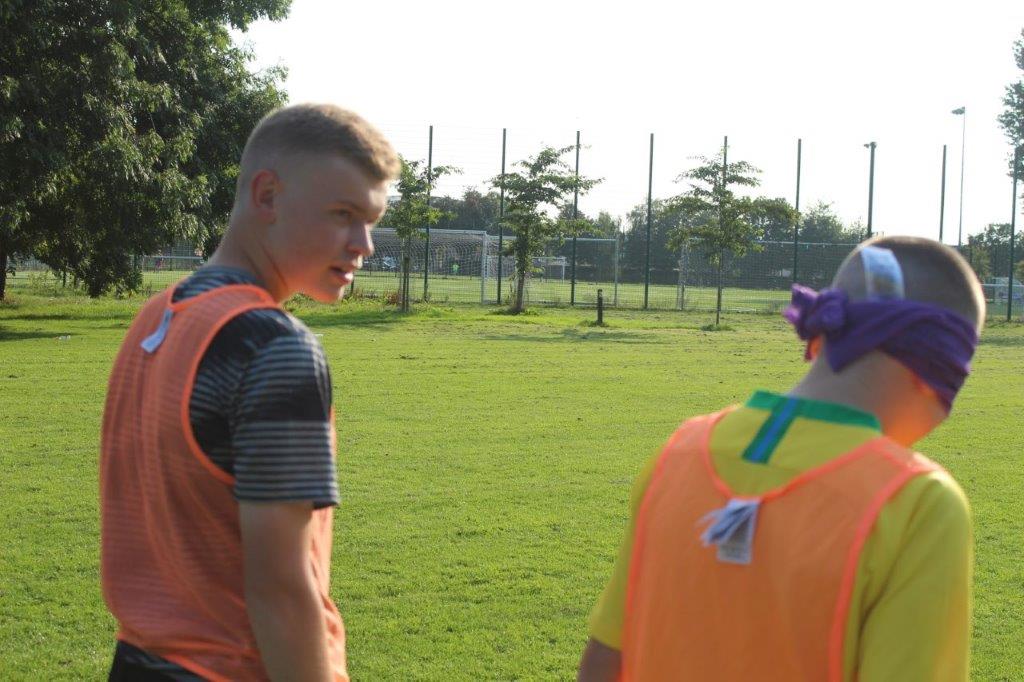 Teaming up. The outcome of this activity is to increase trust and communication between the participants. By one player guiding another through an obstacle course set out on the pitch, they are blindfolded and then guided by a partner. This opens the discussion of how important it is to trust in each other and the importance of good communication.