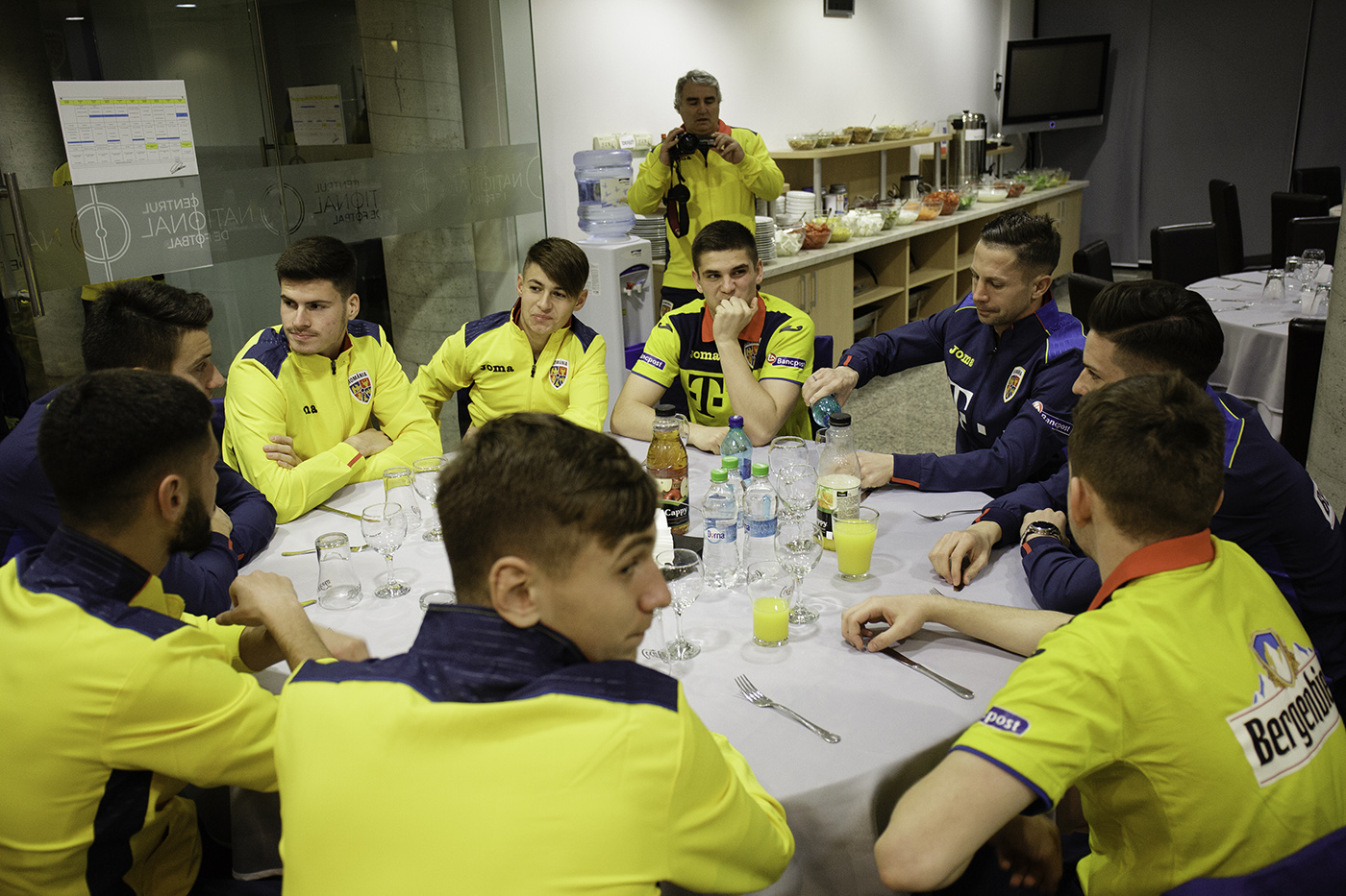 Selecționerul Cosmin Contra i-a întâmpinat pe juniori și i-a invitat pe aceștia să se așeze alături de seniori. Jucătorii naționalei i-au ajutat pe tinerii tricolori să scape de emoțiile acestei întâlniri și au intrat rapid în dialog cu aceștia, oferindu-le chiar și sfaturi pentru următoarele partide.