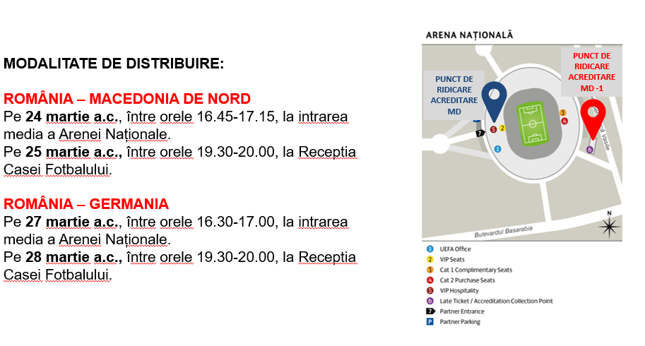 Detalii privind remiterea acreditărilor pentru partidele României de pe Arena Națională, cu mențiunea că accesul jurnaliștilor în Complex va fi permis cu 15 minute înainte de ora prevăzută pentru distribuirea acreditărilor: