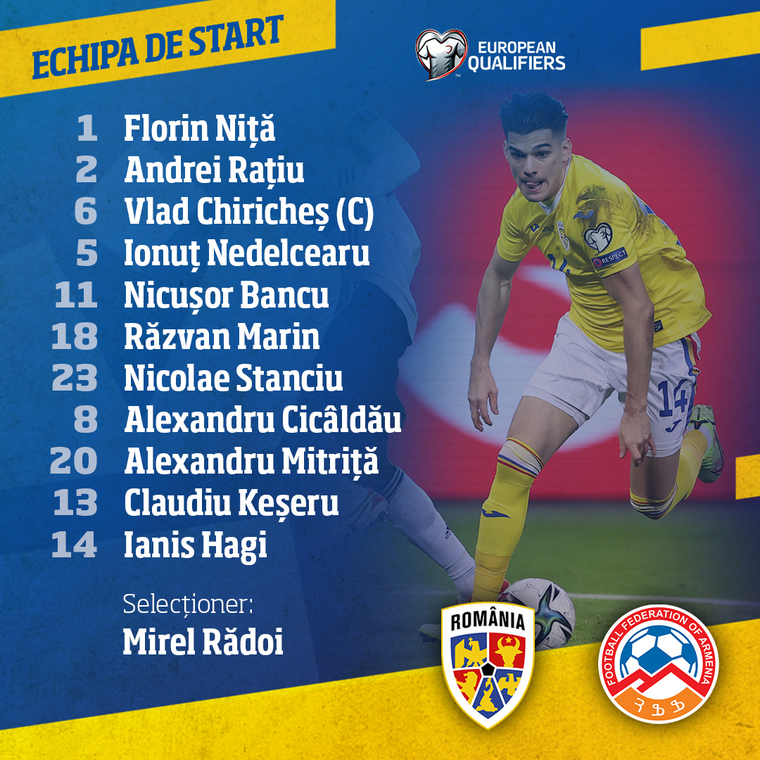 11 pe teren, alți 12 pe bancă, mii în tribune și milioane în lume – toți pentru victoria României în seara asta! Selecționerul Mirel Rădoi a decis să înceapă meciul de azi, cu Armenia, în următoarea formulă: