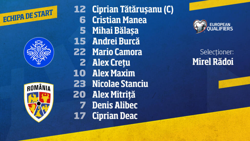 ROMÂNIA: 12. Tătărușanu-cpt. – 6. Manea, 5. Bălașa, 15. Burcă, 22. Camora – 10. Maxim (13. Keșeru, 80), 2. Crețu, 23. Stanciu (8. Cicâldău, 87) – 20. Mitriță (14. Hagi, 46), 7. Alibec (9. Pușcaș, 46), 17. Deac (19. Iancu, 46). Selecționer: Mirel Rădoi