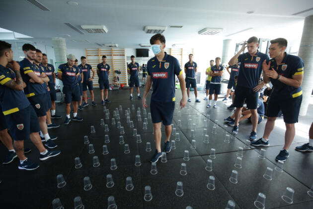Continuă programul de pregătire mentală! Exercițiu pentru consolidarea încrederii în coechipieri, comunicare și coeziune: lotul împărțit în 4 echipe, reprezentantul fiecăreia a pornit legat la ochi prin terenul “minat”, dirijat de coechipieri!