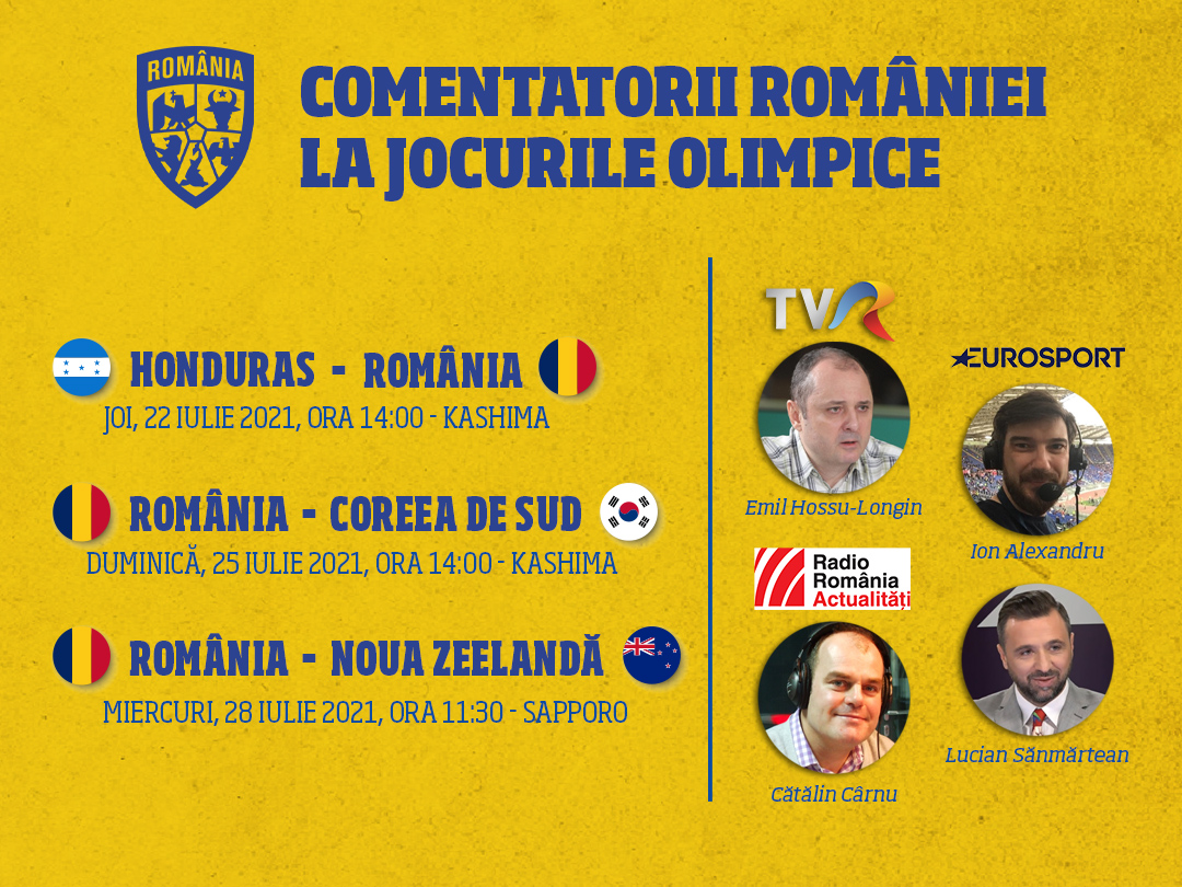 Meciurile tokyotricolorilor vor fi comentate la TVR de Emil Hossu-Longin, nimeni altul decât jurnalistul care a asigurat, alături de Marian Olaianos, și comentariul partidelor de excepție de la EURO U21 din 2019, turneul unde s-a obținut calificarea pentru Jocurile Olimpice!