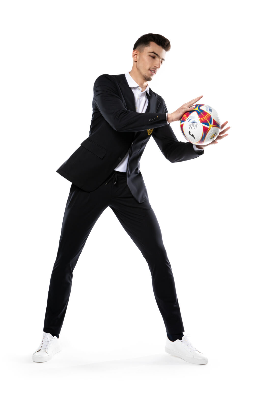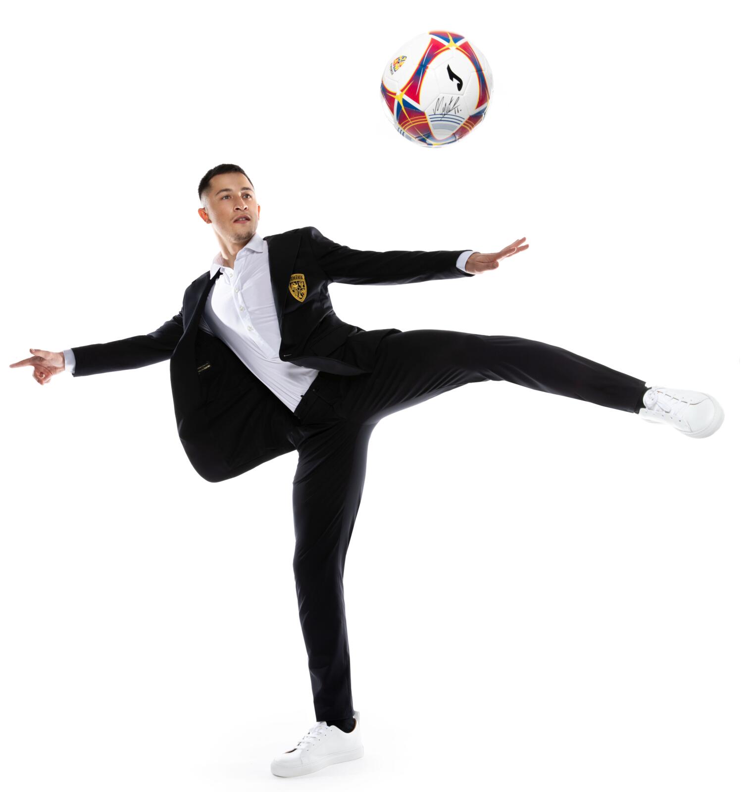 Prin alegeri vestimentare ce ies din tipare, curajul devine factorul diferențiator și în afara jocului. Spiritul tânăr, dinamic, se exprimă prin detalii distinctive precum gluga sacoului, căptușeala perforată sau șnurul din talia pantalonului. Design-ul minimalist și abordarea monocromă se înnobileaza prin blazonul Echipei Naționale brodat în galben pe jachetă.