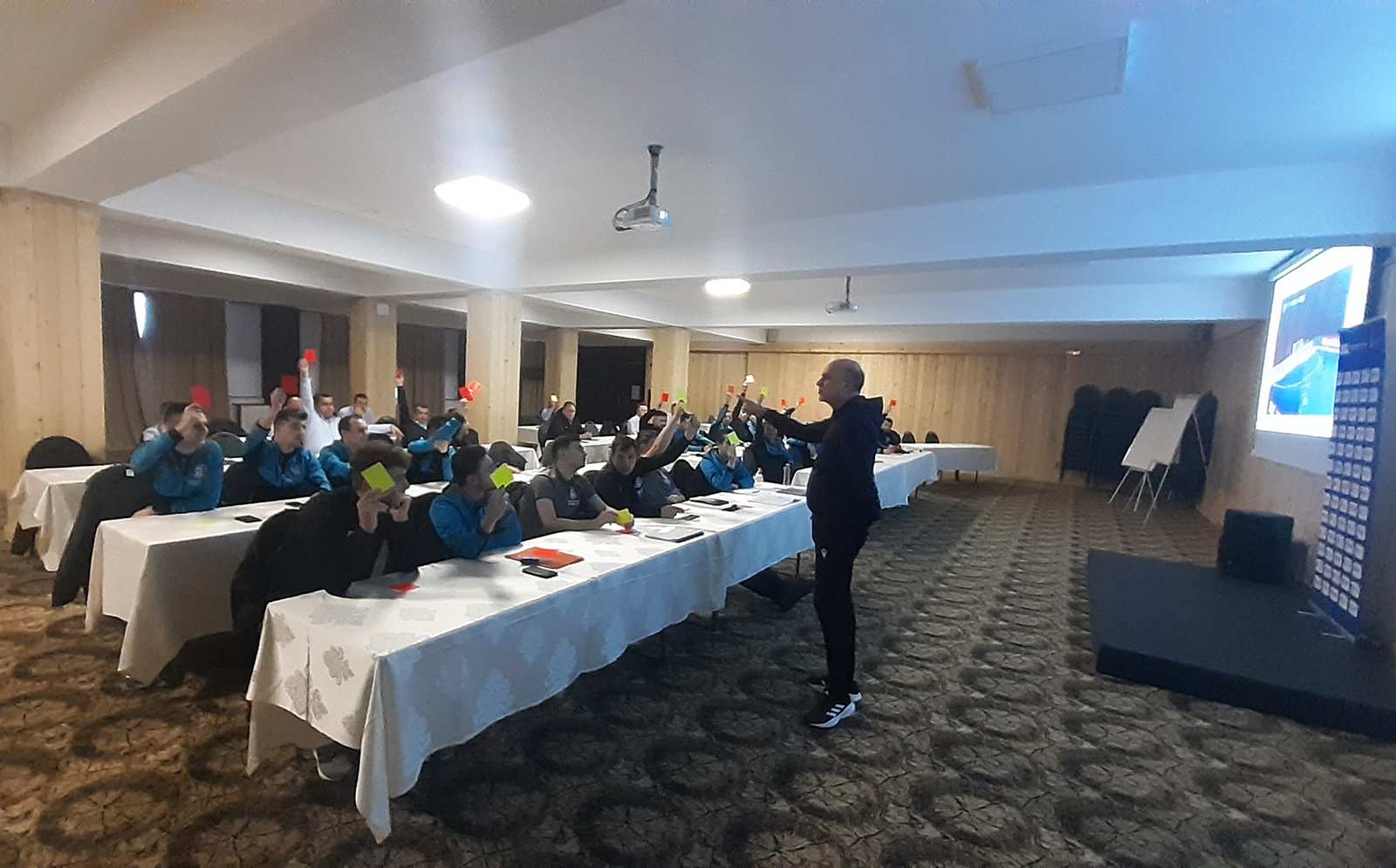 Președintele CCA, Kyros Vassaras, aflat la București pentru testarea arbitrilor din prima ligă, a deschis cursul prin videoconferință în fața celor 26 de arbitri și 15 observatori de futsal prezenți în sală.