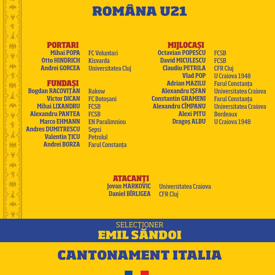 Naționala României U21 va participa în perioada 5-12 iunie la un stagiu de pregătire în Italia, înainte de turneul final EURO 2023, găzduit de România și Georgia.